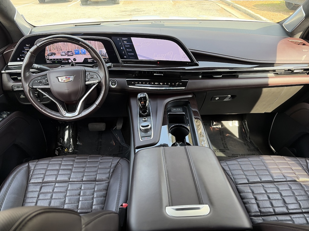 PRICED UNDER MARKET, DEALER INSPECTED AND SERVICED, Certified for extended service contract coverage, AWD, Dark Auburn With Jet Black Accents Leather, 16.9" Diagonal OLED Infotainment Screen, 2-Presets Memory For Driver Seat Adjuster, 3 Years of OnStar & Connected Services Plan, 3.23 Axle Ratio, 3rd row seats: split-bench, 4-Way Power Driver Lumbar Seat Adjuster, 4-Way Power Front Passenger Lumbar Seat Adjuster, 4-Wheel Disc Brakes, 8-Way Power Driver Seat Adjuster, 8-Way Power Front Passenger Seat Adjuster, A/V remote, ABS brakes, Adaptive Cruise Control, Adaptive suspension, Air Conditioning, Air Ride Adaptive Suspension, AKG Studio Reference 36-Speaker Audio System, Alloy wheels, AM/FM radio: SiriusXM with 360L, Apple CarPlay/Android Auto, Audio memory, Auto High-beam Headlights, Auto tilt-away steering wheel, Auto-dimming door mirrors, Auto-dimming Rear-View mirror, Automatic Seat Belt Tightening, Automatic temperature control, Body-Color Door Handles, Brake assist, Bumpers: body-color, Cat-Back Performance Exhaust (LPO), Compass, Delay-off headlights, Door auto-latch, Door Lock & Latch Shields, Driver door bin, Driver vanity mirror, Dual front impact airbags, Dual front side impact airbags, Electronic Limited-Slip Differential, Electronic Stability Control, Emergency communication system: OnStar and Cadillac connected services capable, Enhanced Automatic Emergency Braking, Enhanced Automatic Parking Assist, Exterior Parking Camera Rear, Floor Console w/Covered Storage, Four wheel independent suspension, Front anti-roll bar, Front Auxiliary 12-volt Power Outlet, Front Bucket Seats, Front Center Armrest w/Storage, Front dual zone A/C, Front License Plate Bracket, Front reading lights, Full Semi-Aniline Leather Seat Trim, Fully automatic headlights, Garage door transmitter, Genuine wood console insert, Genuine wood dashboard insert, Genuine wood door panel insert, Glass Breakage Sensor, Gloss Black Escalade Nameplate (LPO), HD Radio, Headphones, Heads-Up Display, Heated & Ventilated Driver & Front Passenger Seats, Heated door mirrors, Heated Driver & Front Passenger Seats, Heated front seats, Heated rear seats, Heated steering wheel, Hitch Guidance w/Hitch View, Illuminated Cargo Sill Plate (LPO), Illuminated entry, Illuminating Front & Rear Sill Plates, Integrated Trailer Brake Controller, Leather steering wheel, Low tire pressure warning, Magnetic Ride Control Suspension, Memory seat, Navigation System, Night Vision, Not Equipped w/2nd Row Express-Up Window Control, Occupant sensing airbag, Outside temperature display, Overhead airbag, Overhead console, Panic alarm, Passenger door bin, Passenger vanity mirror, Platinum Interior Trim, Power door mirrors, Power driver seat, Power Liftgate, Power Lumbar Massage Driver Seat, Power Lumbar Massage Front Passenger Seat, Power moonroof, Power Panoramic Tilt-Sliding Sunroof, Power passenger seat, Power steering, Power windows, Power-Retractable Assist Steps, Preferred Equipment Group 1SH, Radio data system, Radio: AM/FM w/Navigation, Rain sensing wipers, Rear air conditioning, Rear anti-roll bar, Rear audio controls, Rear Camera Mirror, Rear Camera Mirror Washer, Rear Cross Traffic Alert, Rear reading lights, Rear Seat Entertainment System, Rear window defroster, Rear window wiper, Reconfigurable Full-Color Head-Up Display, Remote keyless entry, Reverse Automatic Braking, Running Board Assist Steps, Security system, SiriusXM w/360L, Smart Trailer Integration Indicator, Soft Closing Front & Rear Doors, Speed control, Split folding rear seat, Spoiler, Steering wheel memory, Steering wheel mounted audio controls, Super Cruise, Tachometer, Teen Driver, Telescoping steering wheel, Theft-Deterrent Alarm System, Tilt steering wheel, Touring Package, Traction control, Trailer Side Blind Zone Alert, Trip computer, Turn signal indicator mirrors, Variably intermittent wipers, Vehicle Inclination