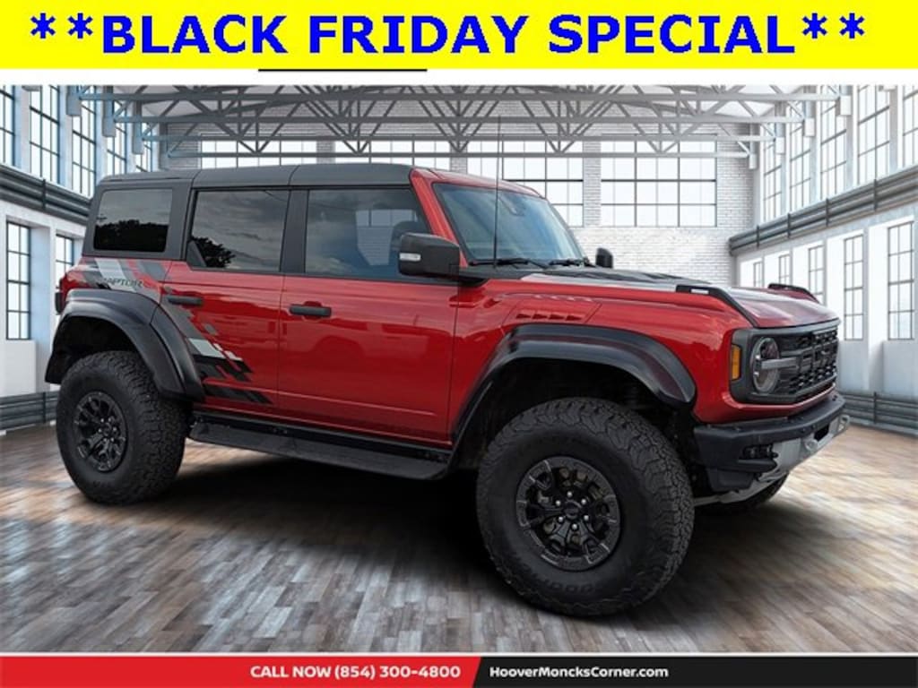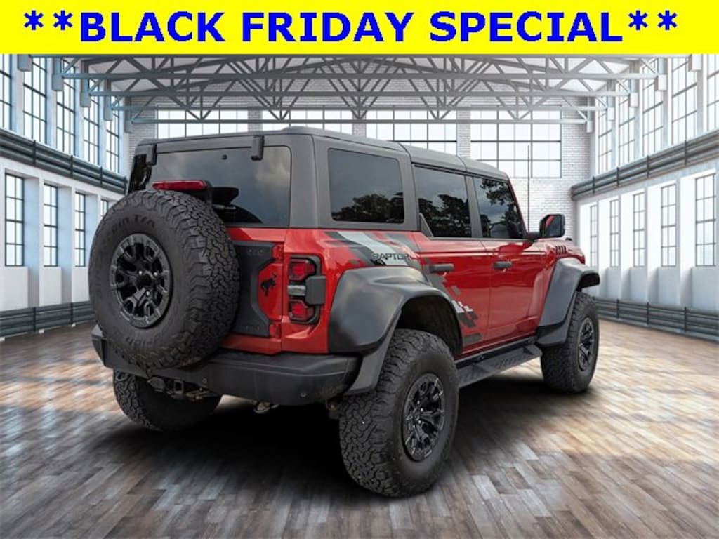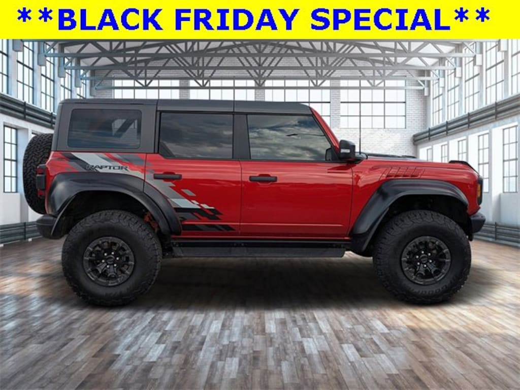 72 point inspection, Certified for extended service plan, Priced below market value, Bronco Raptor, 4D Sport Utility, 3.0L EcoBoost V6, 10-Speed Automatic, 4WD, Hot Pepper Red Metallic Tinted Clearcoat, Black Onyx Vinyl, 10 Speakers w/Subwoofer, 2 Smart Charging USB Ports In Dashboard, 4-Wheel Disc Brakes, 4.7 Axle Ratio, 7 Speakers, ABS brakes, Adaptive Cruise Control, Air Conditioning, Alloy wheels, AM/FM radio: SiriusXM with 360L, AM/FM Stereo, Auto High-beam Headlights, Auto-dimming Rear-View mirror, Automatic temperature control, Brake assist, Compass, Connected Built-In Navigation, Connected Navigation, Delay-off headlights, Driver vanity mirror, Dual front impact airbags, Dual front side impact airbags, Electronic Stability Control, Emergency communication system: 911 Assist, Equipment Group 374A Lux Package, Evasive Steering Assist, Exterior Parking Camera Rear, Front anti-roll bar, Front Bucket Seats, Front Center Armrest, Front dual zone A/C, Front fog lights, Front reading lights, Front wheel independent suspension, Fully automatic headlights, Glass rear window, Hard Top Sound Deadening Headliner (DISC), Heated door mirrors, Heated front seats, Heated Steering Wheel, Illuminated entry, Integrated roll-over protection, Keyless Entry Keypad, Leather Shift Knob, Low tire pressure warning, Lux Package, Marine Grade Vinyl Bucket Seats, Navigation system: Connected Navigation, Occupant sensing airbag, Outside temperature display, Overhead airbag, Overhead console, Panic alarm, Passenger door bin, Passenger vanity mirror, Power door mirrors, Power steering, Power windows, Radio data system, Radio: B&O Sound System by Bang & Olufsen, Rear anti-roll bar, Rear seat center armrest, Rear window defroster, Rear window wiper, Remote keyless entry, Security system, SiriusXM Radio w/360L, Speed control, Split folding rear seat, Steering wheel mounted audio controls, SYNC 4, Tachometer, Telescoping steering wheel, Tilt steering wheel, Traction control, Trip computer, Turn signal indicator mirrors, Universal Garage Door Opener, Upgraded Raptor Graphic, Variably intermittent wipers, Voltmeter, Wheel Lock Kit (DIO), Wheels: 17" Black High Gloss-Painted Aluminum, Wheels: 17" Dark Carbonized Gray Alloy Painted, Wireless Charging Pad, Convertible HardTop, Convertible roof lining, Driver door bin, NAVIGATION, BACKUP CAMERA, BLUETOOTH, HEATED SEATS, HEADS UP DISPLAY, KEYLESS ENTRY, 4x4, Bronco Raptor, 4D Sport Utility, 3.0L EcoBoost V6, 10-Speed Automatic, 4WD, Hot Pepper Red Metallic Tinted Clearcoat, Black Onyx Vinyl, 10 Speakers w/Subwoofer, 2 Smart Charging USB Ports In Dashboard, 4-Wheel Disc Brakes, 4.7 Axle Ratio, 7 Speakers, ABS brakes, Adaptive Cruise Control, Air Conditioning, Alloy wheels, AM/FM radio: SiriusXM with 360L, AM/FM Stereo, Auto High-beam Headlights, Auto-dimming Rear-View mirror, Automatic temperature control, Brake assist, Compass, Connected Built-In Navigation, Connected Navigation, Delay-off headlights, Driver vanity mirror, Dual front impact airbags, Dual front side impact airbags, Electronic Stability Control, Emergency communication system: 911 Assist, Equipment Group 374A Lux Package, Evasive Steering Assist, Exterior Parking Camera Rear, Front anti-roll bar, Front Bucket Seats, Front Center Armrest, Front dual zone A/C, Front fog lights, Front reading lights, Front wheel independent suspension, Fully automatic headlights, Glass rear window, Hard Top Sound Deadening Headliner (DISC), Heated door mirrors, Heated front seats, Heated Steering Wheel, Illuminated entry, Integrated roll-over protection, Keyless Entry Keypad, Leather Shift Knob, Low tire pressure warning, Lux Package, Marine Grade Vinyl Bucket Seats, Navigation system: Connected Navigation, Occupant sensing airbag, Outside temperature display, Overhead airbag, Overhead console, Panic alarm, Passenger door bin, Passenger vanity mirror, Power door mirrors, Power steering, Power windows, Radio data system, Radio: B&O Sound System by Bang & Olufsen, Rear
